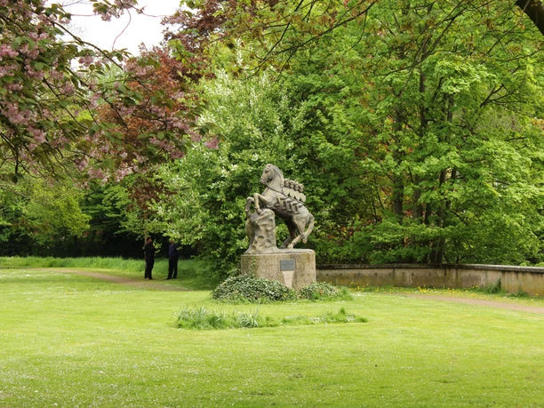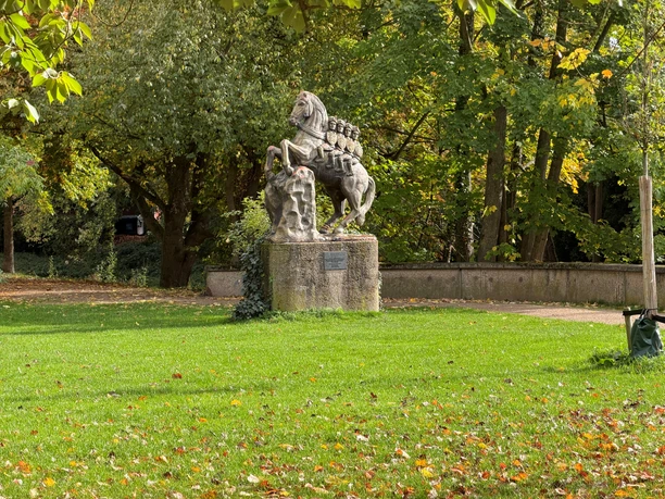 The two-metre-high sculpture - a gift from the city of Dendermonde in Belgium - recalls the story of Haimon (Aimon) and his four sons, who fled to safety on the back of the "miracle horse" after their father was captured by Charlemagne's troops. The 4.85 meter high and over 5 meter long original stands in Dendermonde and is the landmark of Nienburg's twin town.
