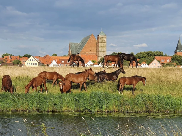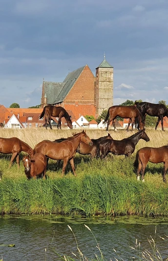 A few kilometers further you reach the Badener Berge in Achim-Baden, from which there is a magnificent view. According to legend, the pirate Klaus Störtebeker once hid here. Your route now leads over the Weser bridge to Thedinghausen or you take the alternative route on the right Weser side past the Achim windmill and the city center of Achim to Bremen. Achim derives from "Acheim", meaning "place by the water." Charming, between modernity and old architecture, is the pedestrian zone of the 30,000-inhabitant town, where fresh products traditionally arrive at the weekly market on Wednesdays and Saturdays. Worth seeing are, among others, the Clüverhaus, St. Laurentius Church, and the gatehouse.
